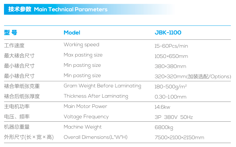 JBK-1100简易自动卡纸裱合机,采用面纸及底纸分别设置新型的飞达真空输纸机,并采用重叠走纸方式,使送纸过程更加平稳准确。底纸上胶依贴合纸张的不同要求,可调整涂布厚薄程度。配置涂胶调整系统,可在不停机状态下操作,使胶水涂布更薄,更均匀,达到提高工作效率又节省胶水的效果。底、面纸由一对高强度咬纸复合辊定位、贴合、初压合后进入压合辊经过多次压合输出,成品进入收纸机,用三面齐纸的方式进行堆积,纸堆高度可达1650mm。该机结合了手动机和自动机的优点,大大降低了“人力成本”,提高了裱合效率,更“经济、合理、、高效”。